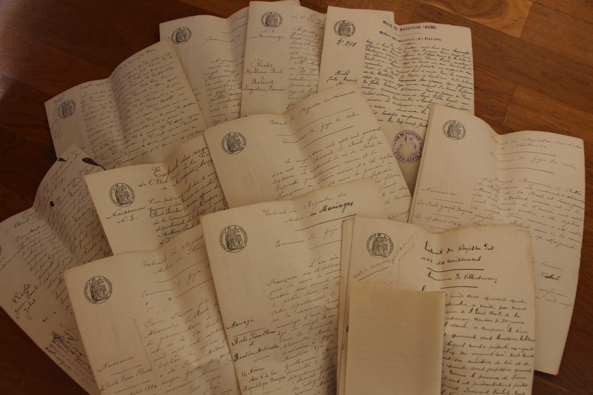 Les actes concernent la filiation directe de la famille De RIOLS depuis Alexandre (le dernier verrier) à Jules et Mathieu. Sur le cahier, on retrouve des notes sur les origines de la famille De RIOLS de Moussan, ainsi que des copies manuscrites d’actes.